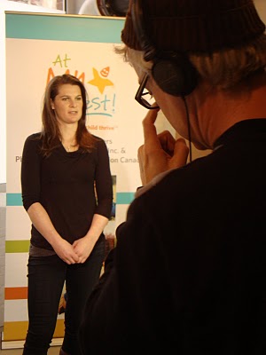 Jennifer Botterill, Tessa’s teammate (and a three-time Olympic gold medallist!), talks about the importance of children’s health while the director looks on.